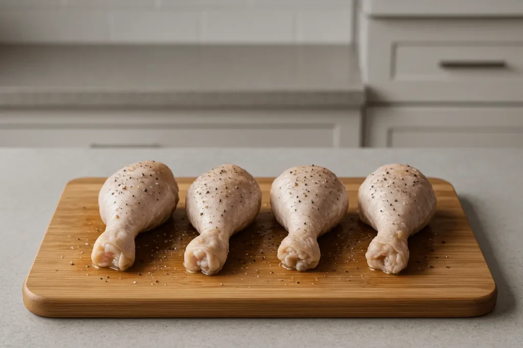 Start med at forvarme airfryeren til 180°C. Tør kyllingelårene med køkkenrulle for at fjerne overskydende fugt. Pensl dem derefter med lidt olie og krydr med salt, peber og dine foretrukne krydderier.