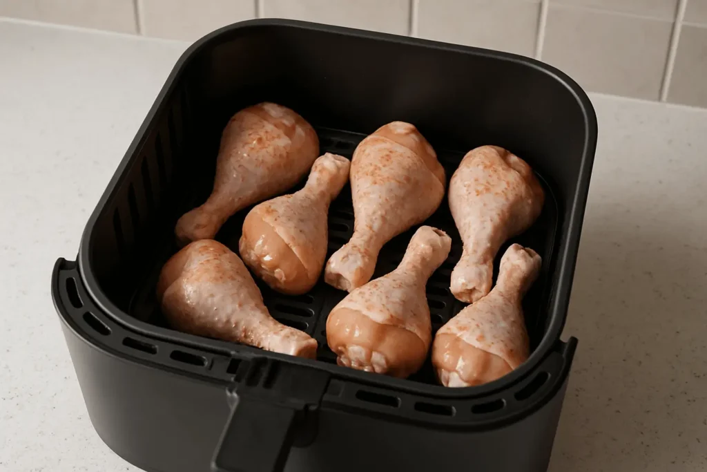 Placer kyllingelårene i kurven i et enkelt lag, så luften kan cirkulere frit omkring dem. Tilbered dem i airfryeren ved 180°C i cirka 25-30 minutter. Vend dem halvvejs igennem tilberedningen for at sikre en jævn sprødhed.